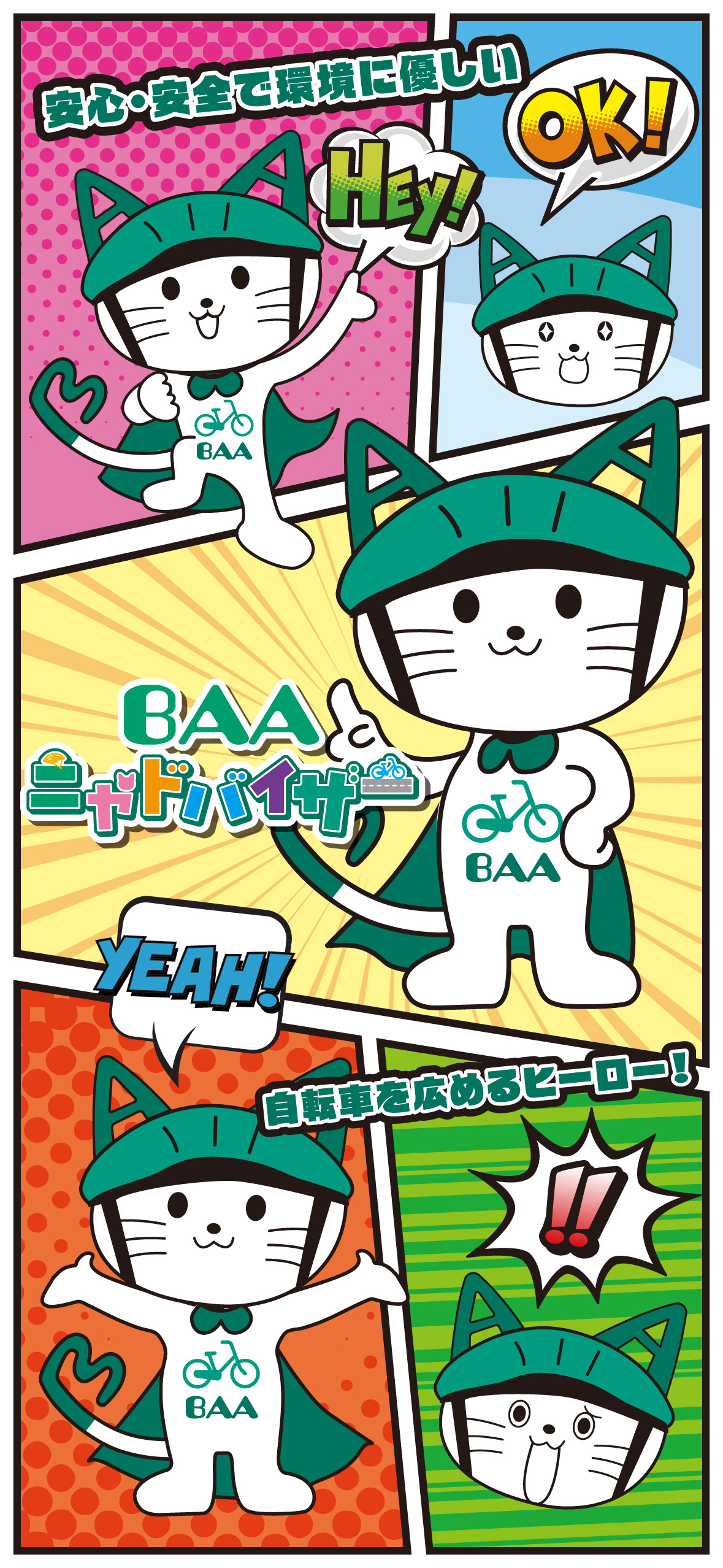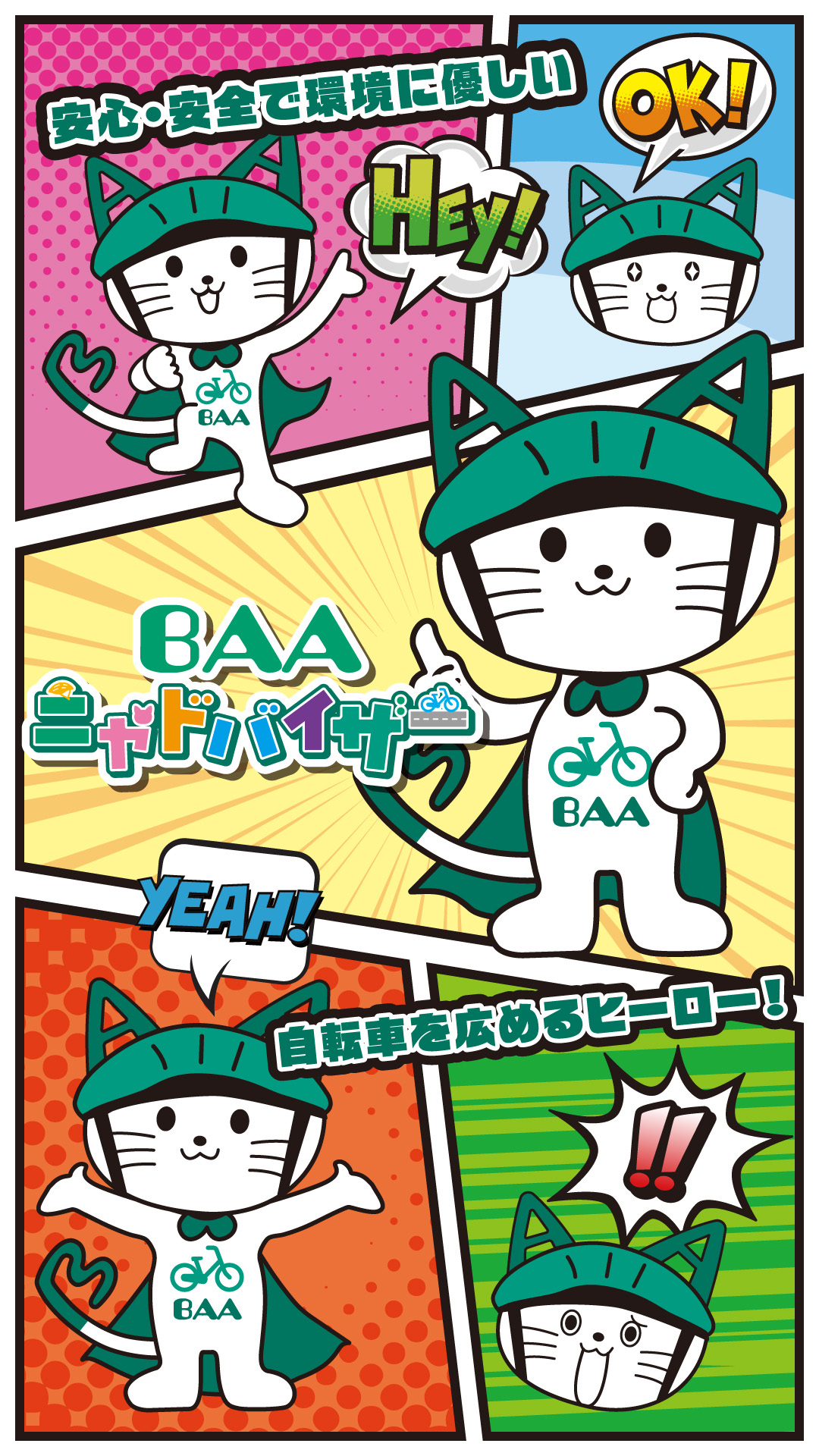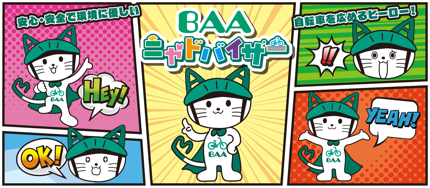 ぼくの名前は BAAニャドバイザー だよ! 誕生日は 5月5日 の 自転車の日 なんだ。 性格は 明るくて世話好き で、 チャームポイントはBのしっぽとAの耳。 口ぐせは ニャイスニャイスだよ!「安全・安心で環境に優しい自転車選びのプロフェッショナル」であるBAAアドバイザーを広く知ってもらえるように努力をしているんだ。